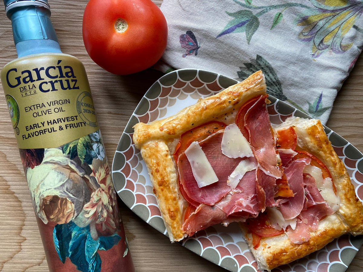 6. Put the tomato and the grated Parmesan over the puff pastry and drizzle with García de la Cruz Organic Extra Virgin Olive Oil.